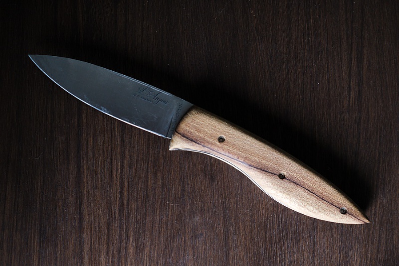 ![]() Couteau de l'atelier Altaïr - Voir en plus grand Appelé "Cosmos" par le coutelier Noël Laïos, ce couteau pliant est doté d'une lame en inox. Son manche est en érable negundo et fibre de carbone. ![]() Couteau de Boris Klein - Voir en plus grand Ce "couteau n° 2" a une lame damassée. La planche à découper a été fabriquée par Lawson Morris Bespoke Carpentry and Joinery (Pays de Galles). |