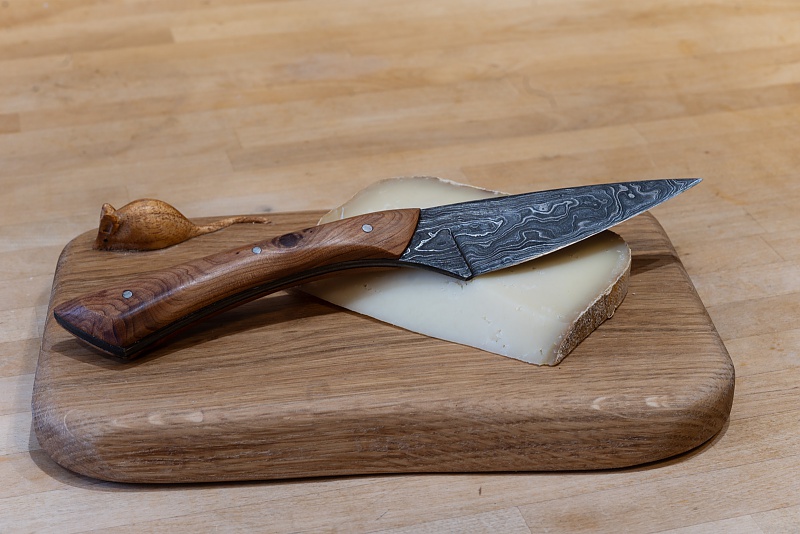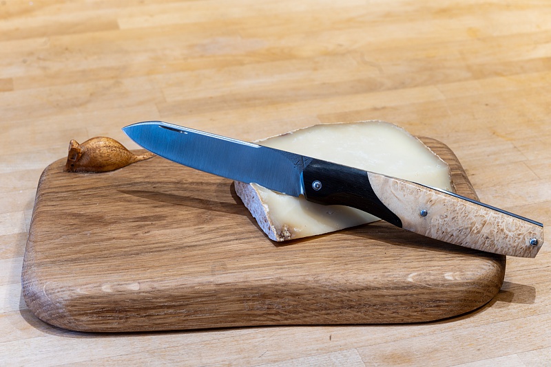 ![]() Couteau de l'atelier Altaïr - Voir en plus grand Appelé "Cosmos" par le coutelier Noël Laïos, ce couteau pliant est doté d'une lame en inox. Son manche est en érable negundo et fibre de carbone. ![]() Couteau de Boris Klein - Voir en plus grand Ce "couteau n° 2" a une lame damassée. La planche à découper a été fabriquée par Lawson Morris Bespoke Carpentry and Joinery (Pays de Galles). |